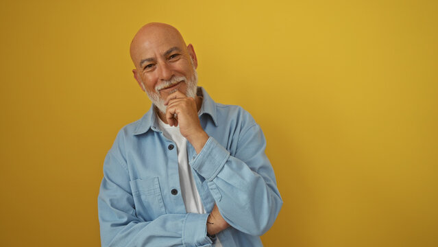 A smiling man with a beard, thoughtfully touching his chin, gazes upward.