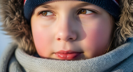 Young girl with winter coat and hat looking thoughtfully outdoors