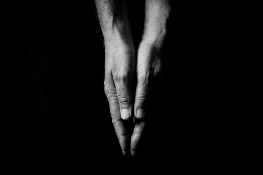 Two male hands touching, palms pressed together.
