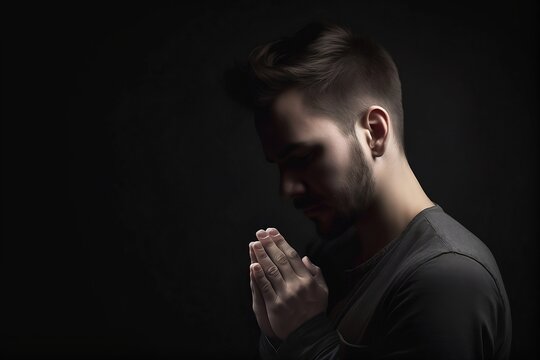 Young man praying in the dark room with his hands folded in prayer created with Generative AI technology