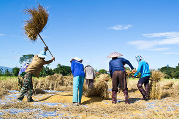Rural life for more than 70% of Thai farmers involves farming. The beating of rice as pictured, is a method of separating the grain from the rice stalk or straw.