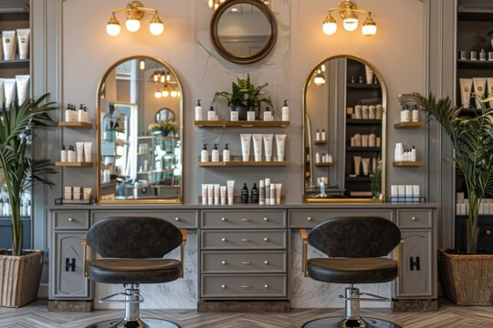 A beauty salon interior with chic design elements, featuring mirrors, chairs, and beauty products on display