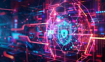 A futuristic, abstract background with geometric patterns and neon lines, illustrating cyber resilience with icons representing threat detection, incident response, and continuity planning
