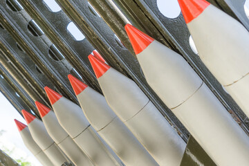 Combat missiles in a row, warhead, projectile. Weapons of mass destruction, nuclear chemical