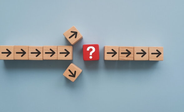 Question mark print screen on red wooden block cross in the middle of arrow for interrupt of process concept.