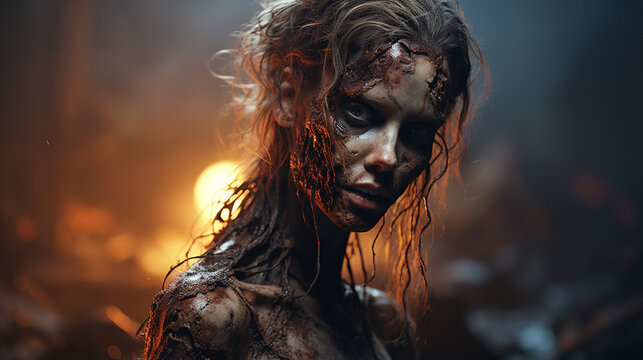 A furious bloodthirsty zombie woman wanders through an old abandoned house. Obsessed bloody woman. Horror, thriller. Halloween.