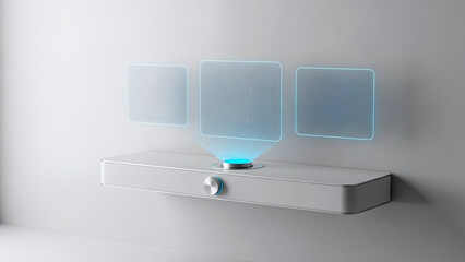 A sleek device projects three glowing blue holographic panels above a minimalist wall-mounted console with a central control knob.