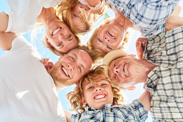 Happy three generations of men hugging, sitting on cozy couch at home, cute adorable little boy cuddling with young father and mature grandfather on sofa, family spending leisure time together