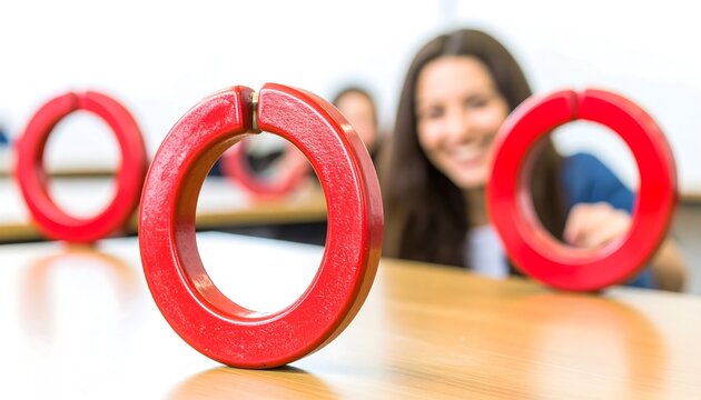 A still life composition featuring a pink holder with black and white striped straws, two small teardrop-shaped objects, and three colorful jars (pink, blue, or