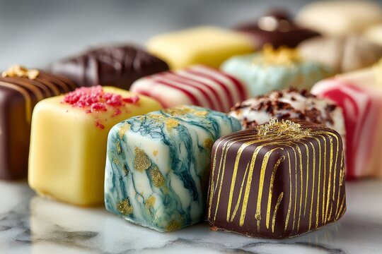 assorted chocolates in three rows of four, placed on white marble surface, elegant high-end confectionery product. Generative AI