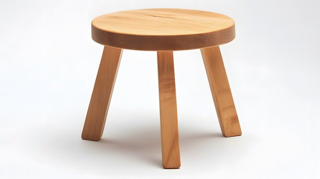 Stunning photo of wooden stool with round seat, three legs on white background. Simple minimalist design, clean lines. Natural wood grain texture. Scandinavian style furniture.
