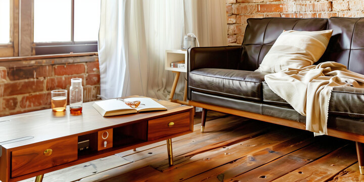 Cozy living room with steaming cup on sofa and rainy city street through large window