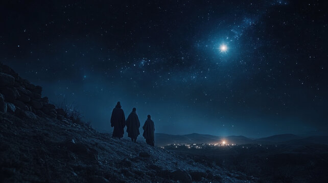 Happy Epiiphany day. Three wise man ant star on blue background.