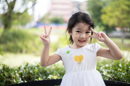 Sweet, happy, smiling three year old girl playing in a park outdoor.