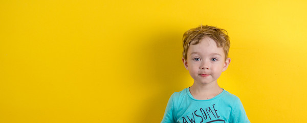 Portrait of cute little boy holds balloon, smiles, looks at camera. Three years old child, birthday