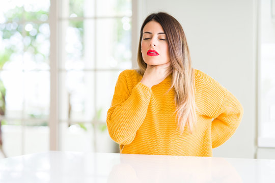 Young beautiful woman wearing winter sweater at home Touching painful neck, sore throat for flu, clod and infection