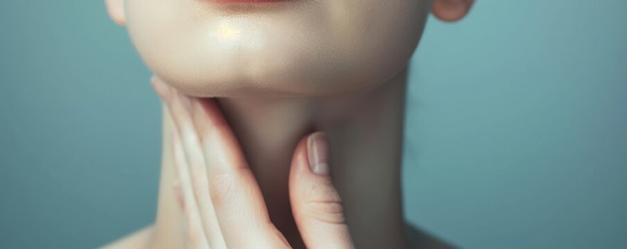Close-up of a woman touching her neck, highlighting throat health and wellness with a soft blue background.