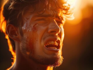 Athlete with throbbing injury, on field, grimace of pain, sunset, dramatic lighting, low angle, intense mood, golden hour