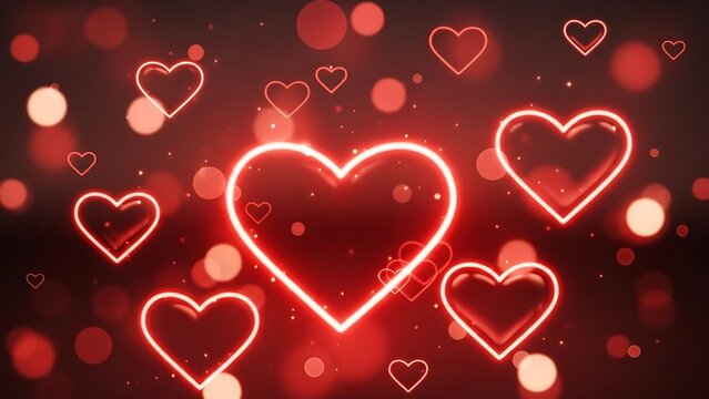 Red neon heart lights on dark background with bokeh effect romantic scene