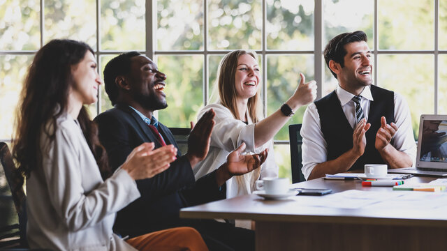 Group of four professional multiethnic businessmen and businesswomen sitting, clapping hands and showing thump up gesture to celebrate the new project in a company meeting at office working table
