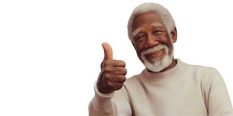 Aged good looking smiling senior black grandpa with the thump up isolated on transparent background, retirement promo concept for old man