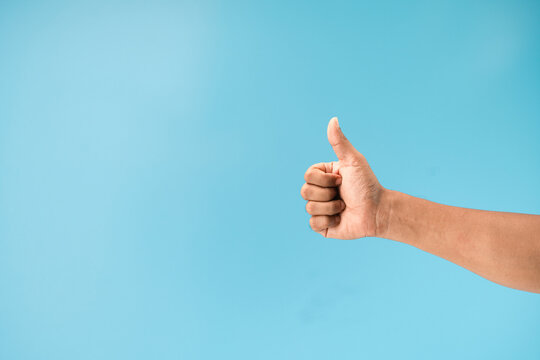 Thump up hand sign isolated on blue background. Business concept