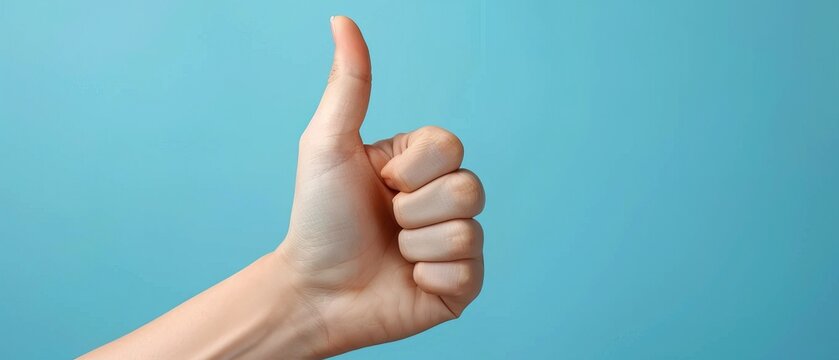 Thump up hand sign isolated on blue background.