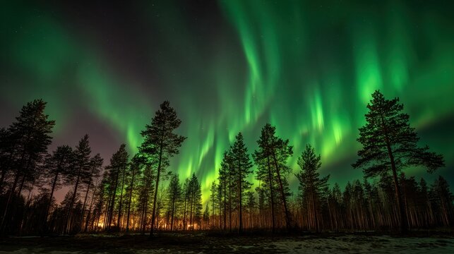 Vibrant green auroras dance over a snowy landscape surrounded by tall dark trees under a starry sky.