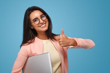 Teamwork of businessman thump up. Group of smiling young multi ethnic business people enjoying and showing gesture cool thumbs up. Team work, corporate, success concept.