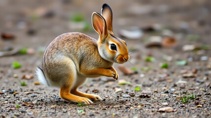 Rabbit thumping its hind leg rapidly on the ground signaling danger to its companions after hearing a sudden loud noise eyes wide and nostrils flared ready to bolt if necessary