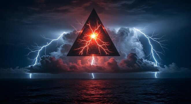 Dramatic lightning storm over the sea with a glowing triangle in the sky at night