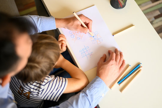 Father and son playing game tic tac toe