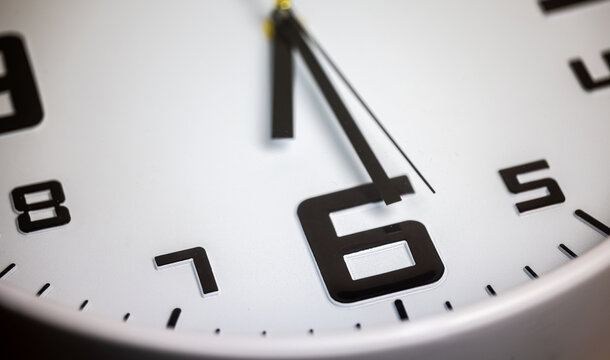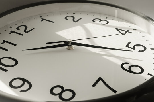 Nice metal hands of white clock go forward. wall clock shows time. Indistinguishable time, light from window on background.
