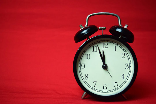 simple classic black and white round wall clock isolated on white. Clock with arabic numerals on wall shows 17:00, 5:00