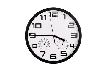 simple classic black and white round wall clock isolated on white. Clock with arabic numerals on wall shows 15:45 , 3:45