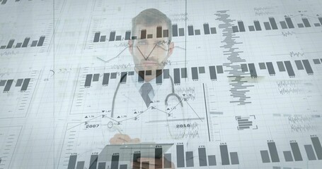 Displaying data visuals occupying center of blue screen, with vertical bar chart, candles and lines