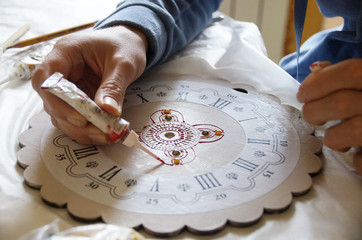 Photo of a painted clock. handmade painting process of a clock on wood-based with acrylic liners in the point-to-point style
