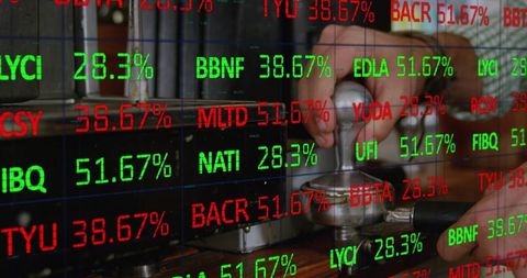 Barista tamping portafilter with stock ticker overlay blending coffee craft and finance