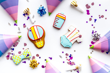 Cook gingerbread cookies for baby shower and ticker tape on white background top view