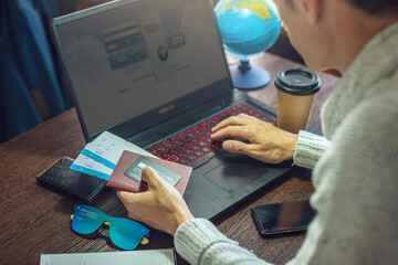 Man is buying air tickets over the Internet using a laptop for a trip. Online purchase and booking of travel tours