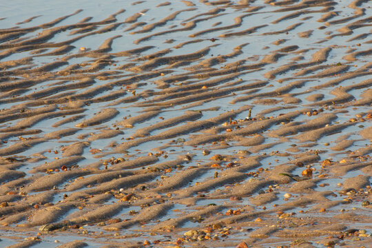 Tidal sand ripples at low tide featuring patterned ridges, shallow pools, minimalist shore