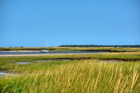 Views of mudflats at low tide from Norfolk Coast path National Trail near Burnham Overy Staithe, Scolt Head Island to rear, East Anglia, England, UK.