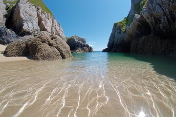 A wide-angle shot of a secluded beach with rocks and tidal pools, capturing natural beauty and calmness
