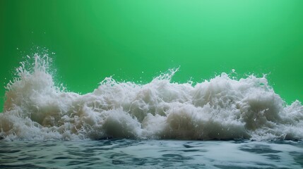 A turbulent brown wave crashes onto the shore, foaming intensely against a vibrant green background, creating a high-energy scene.