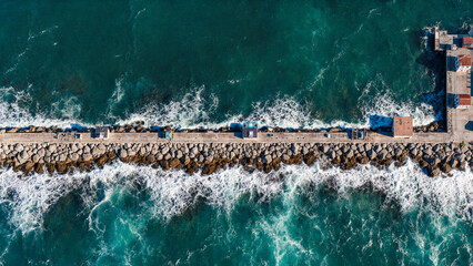 Beautifully detailed aerial drone landscape image of bird's eye view of waves crashing over rocks at shore