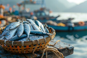 Freshly caught fish in a woven basket by the sea with boats in the background.