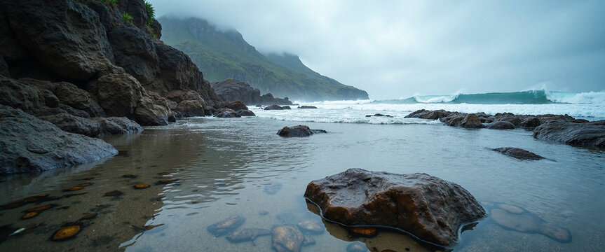 Misty coast with rocky shoreline and vibrant tidal pools reflecting the moody sky, suggesting the untouched beauty of nature
