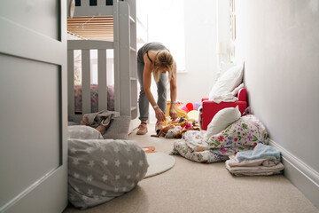 Female cleaner tidying children's bedroom