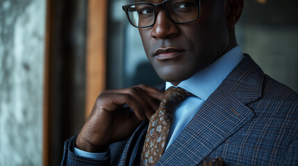 Elegant man in black suit with patterned tie in studio setting
