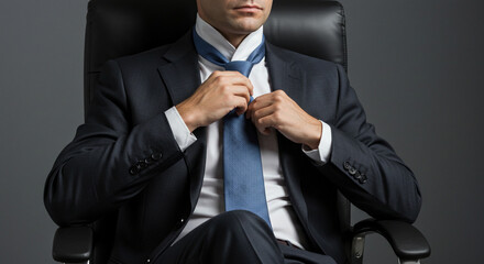 Businessman adjusting tie in office chair professional attire corporate fashion style and confidence look